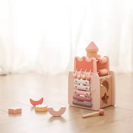 Čudovita lesena igrača v obliki gradu, ki združuje več načinov igre: vstavljanje likov, sestavljanje stolpičev, igranje z lesenimi figurami in tipkanje s priloženo palčko. Zabava, ki razvija logiko, domišljijo in fino motoriko.