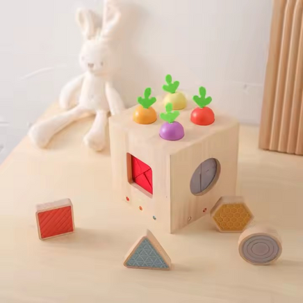 Unikatna lesena vstavljanka, ki povezuje učenje skozi igro. Malčki bodo z veseljem vstavljali barvne oblike in »pobrali« pisančke korenčke – popolna kombinacija za razvoj spretnosti in zabavo!
